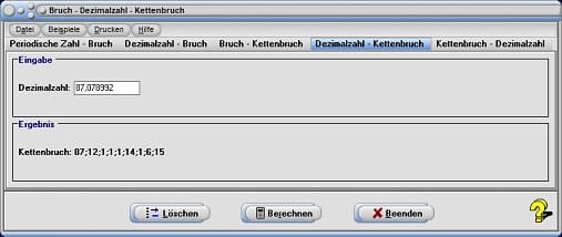 Um eine Zahl, die als Bruch vorliegt, in einen Kettenbruch zu wandeln, steht das Registerblatt Bruch - Kettenbruch zur Verfügung. Soll eine Zahl in Form eines Bruchs in einen Kettenbruch gewandelt werden, so geben Sie die Werte für Zähler und Nenner des Bruchs in die entsprechenden Felder ein und bedienen hierauf die Schaltfläche Berechnen. Der definierte Bruch wird zusätzlich als Dezimalzahl ausgegeben.