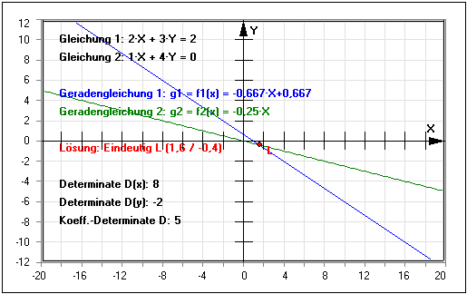 Werden die beiden impliziten Gleichungen 2·x+3·y = 2 und 1·x+4·y = 0 durch die Eingabe der Koeffizientenwerte in die entsprechenden Felder definiert, so ermittelt das Programm nach einer Bedienung der Schaltfläche Berechnen folgende Ergebnisse: