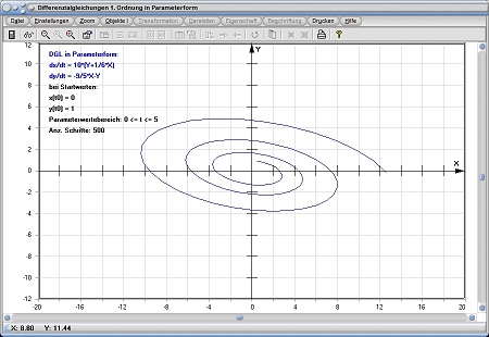 Das Unterprogramm [Algebra] - [Differenzialgleichungen] - DGL 1. Ordnung in Parameterform ermöglicht es, die Lösungskurven gekoppelter Differenzialgleichungen 1. Ordnung, welche in Parameterform gegeben sind, bestimmen zu lassen.