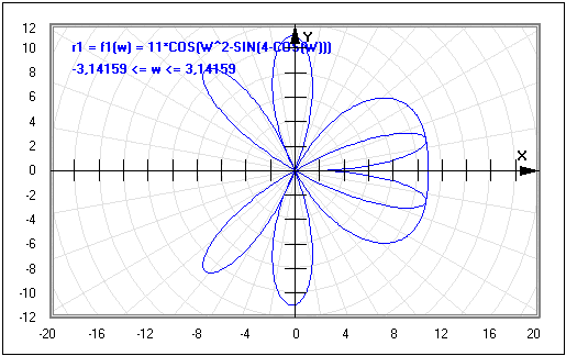 Möchten Sie sich die Funktion r = f(φ) = 10·cos(φ²-sin(4-cos(4-φ))) über einen Bereich -π ≤ φ ≤ π darstellen lassen, so definieren Sie den Funktionsterm 10*COS(W^2-SIN(4-COS(4-W))) im Eingabefeld mit der Bezeichnung r1 = f(w,p) =.