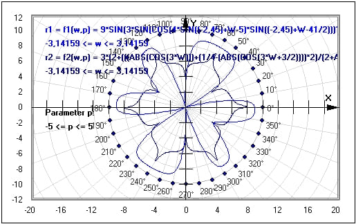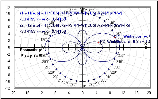 Das Programm hat automatisch erkannt, dass es sich um eine parameterhaltige Funktion handelt und stellt diese zu Anfang mit dem voreingestellten Parameterwert p = -5 dar. Dies bedeutet, dass zunächst die Darstellung der Funktion r1 = f1(w,p) = 9*COS(-(-5)-4*SIN(3*(-5)-3*W)) erfolgt.