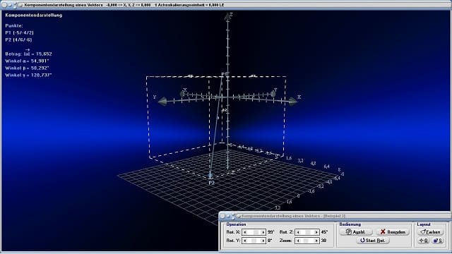 Das Programm ermittelt außerdem den Betrag des Vektors, sowie die Richtungswinkel α, β, und γ zwischen dem entsprechenden Vektor und den Koordinatenachsen.