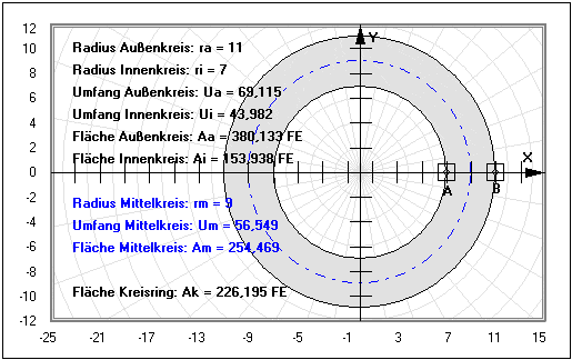 Werden die Koordinatenwerte der Mausfangpunkte mit A (1 / 0) und B (7 / 0) festgelegt, so wird ein Kreisring dargestellt, dessen Eigenschaften folgende sind: