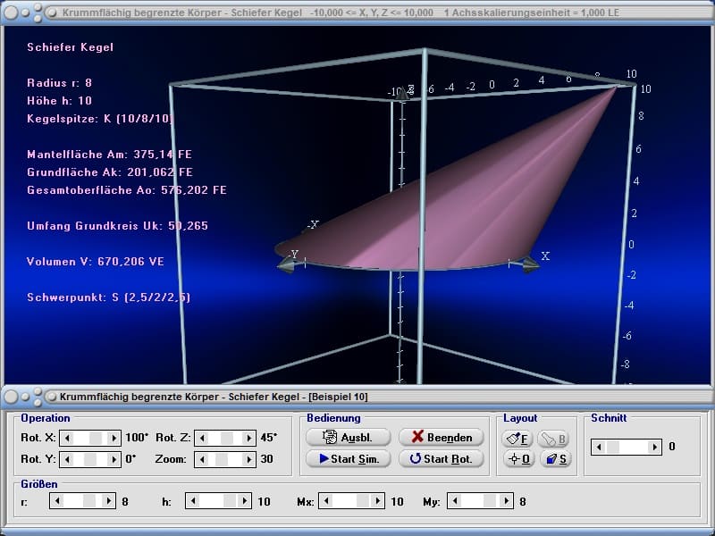 Ein frei bewegbares und drehbares, dreidimensionales Koordinatensystem erlaubt die Praktizierung interaktiver Analysen bzgl. Sachverhalten und relevanter Zusammenhänge zu diesem Fachthema. Neben der Durchführung vom Axialschnitt eines dargestellten Gebildes kann bei der Ausgabe der grafischen Darstellung auch die Ausführung verschiedener 3D-Simulationen der geometrischen 3D-Körper veranlasst werden.