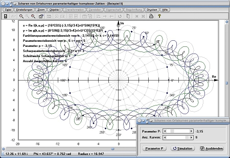 Unter Zuhilfenahme von veränderlichen reellwertigen Parametern ermöglicht es das Programm, Simulationen bei der Darstellung von Kurvenscharen komplexer mathematischer Funktionen durchführen zu lassen.