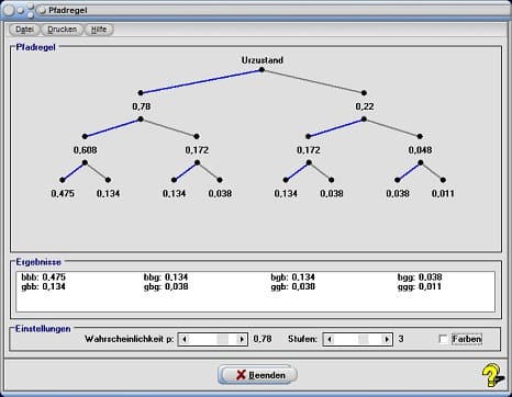 Dieses Unterprogramm bietet die Möglichkeit, sich die Zusammenhänge zur Bestimmung von Wahrscheinlichkeiten prinzipiell grafisch zu veranschaulichen. Eingesetzt werden kann die Pfadregel dann, wenn ein Laplace-Experiment genau 2 mögliche Elementarereignisse besitzt (z.B. Farbe blau oder grau).