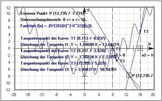 Es gilt, Tangenten an eine Kurve ermitteln zu lassen, die durch den Term f(x) = 4·sin(x²/10-x/5-2) beschrieben wird. Der extern liegende Punkt, durch welchen die Tangenten und Normalen der Kurve verlaufen sollen, sei P (8 / -8) und die Untersuchung ist innerhalb eines gewählten Untersuchungsbereichs -5 ≤ x ≤ 5 durchzuführen.