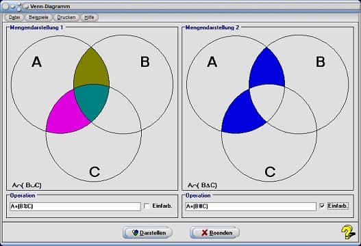 Geben Sie die entsprechende Zeichenfolge in die Felder mit den Bezeichnungen Operation ein und bedienen Sie die Schaltfläche Darstellen. Hierauf wird das Venn-Diagramm angezeigt.