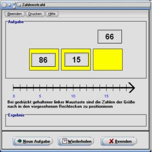 Klicken Sie mit der linken Maustaste auf eines der drei obig angeordneten Zahlensymbole und ziehen Sie dieses an deren korrekte Position im Zahlenstrahl. Befindet sich die Zahl innerhalb des gewählten Rechtecks, so muss die Maustaste losgelassen werden. Wiederholen Sie dies für die beiden anderen Zahlen. Das Programm zeigt daraufhin an, ob die Anordnung bzgl. derer Position auf dem Zahlenstrahl in richtiger Reihenfolge erfolgte, oder nicht.