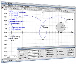 Nach Aufruf des Unterprogramms [Analysis] - [Zykloiden] - [Zykloide] können die, als Rollkurven bezeichneten Funktionen der Art Zykloide dargestellt, sowie die