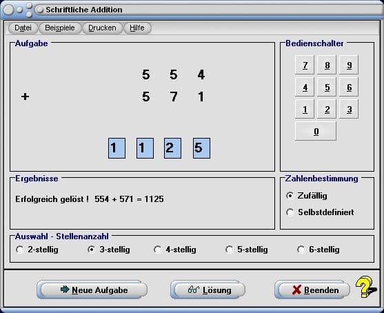 Zahlenstrahl - Römische Zahlen - Schriftliche Addition - Schriftliche Subtraktion - Schriftliche Multiplikation - Schriftliche Division - Schriftliche Potenzierung - Aussagenlogik - Zahltypumwandlung - Zinsrechnung - Zinseszinsrechnung grafisch - Annuitätentilgung - Jahreszinsrechnung - Physikalische Größen - Materialkonstanten - Fachbegriffe Deutsch - Englisch - Mandelbrot- und Juliamengen - Zusammenhänge Mandelbrot-Juliamengen - Sierpinski-Dreieck - Koch-Kurve - Pythagoras-Baum - Feigenbaum-Diagramm - Lindenmayer-System - Lindenmayer-System II - Logistische Gleichung I - Logistische Gleichung II - Diagramme - Tortendiagramm - Kryptografie - Raumgittermodelle (3D) - Paare geordnet - Kalender - Rechnen mit selbstdefinierten Formeln - Zeichenprogramm - Tangram - Tetris - Spiel 15 - Türme von Hanoi - Dame - Schach