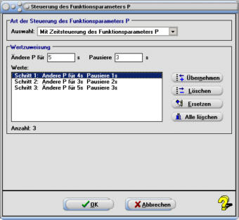 Wird der Eintrag Mit Zeitsteuerung des Funktionsparameters P aus der Auswahlbox Auswahl selektiert, so erscheint folgendes Fenster zur Festlegung von Werten.