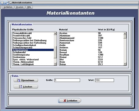 Größen in Tabellen. In diesem Teilprogramm lassen sich die Werte der Materialkonstanten verschiedener Stoffe und Elemente ausgeben.