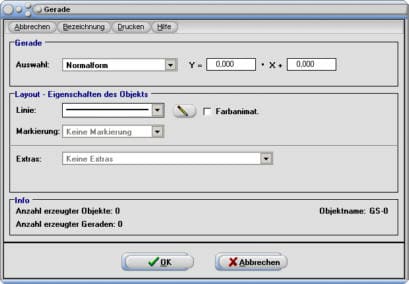 | Hinweise: Standard-Definitionsform einer Gerade dieser Art ist die Normalform. Wird eine Gerade in einer der o.a. anderen Form definiert, so behält sie diese Eigenschaft lediglich solange bei, bis eine Mausoperation mit einem der auf ihr liegenden Punkte durchgeführt wurde. Bei Durchführung einer Eigenschaftsanalyse oder bei Aufruf des oben gezeigten Eingabeformulars wandelt das Programm die andere Definitionsform wieder in Normalform um. Die Lage und die grafischen Eigenschaften der Gerade bleiben identisch. |